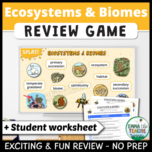 Inject some fun into your review! My ecosystems and biomes SPLAT review game is high energy and a student favorite. It is no prep – simply present the game slides & print the student summary worksheet! Review lesson = done!